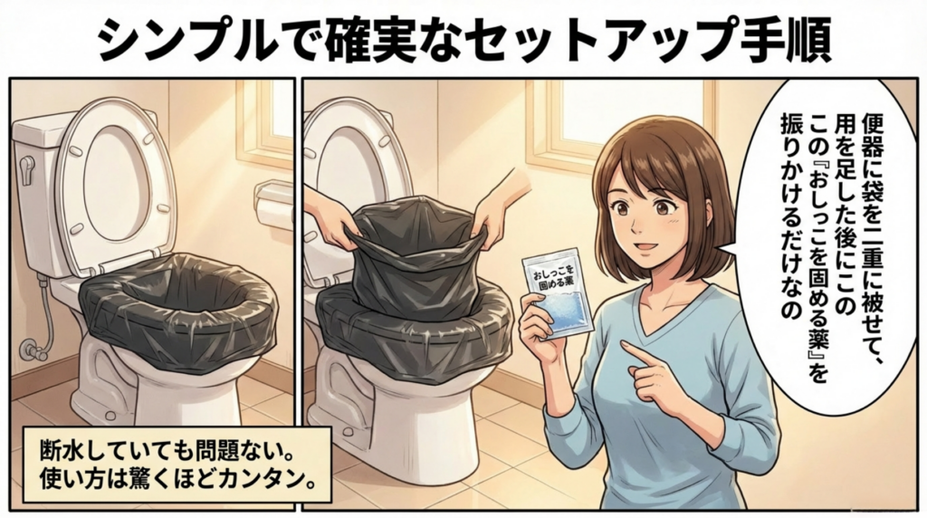 - 「携帯トイレ」の圧倒的な安心感: 断水していても、既存の便器に袋を被せるだけで簡単にセットアップ可能。高吸水性ポリマーなどの凝固剤が水分を素早く固め、イヤなニオイや菌の繁殖を抑えます。