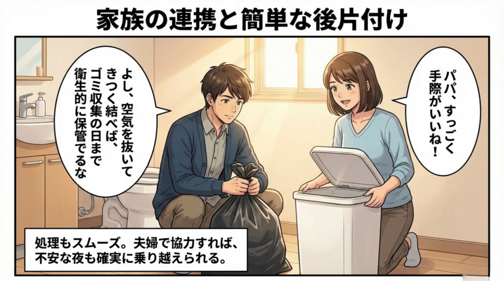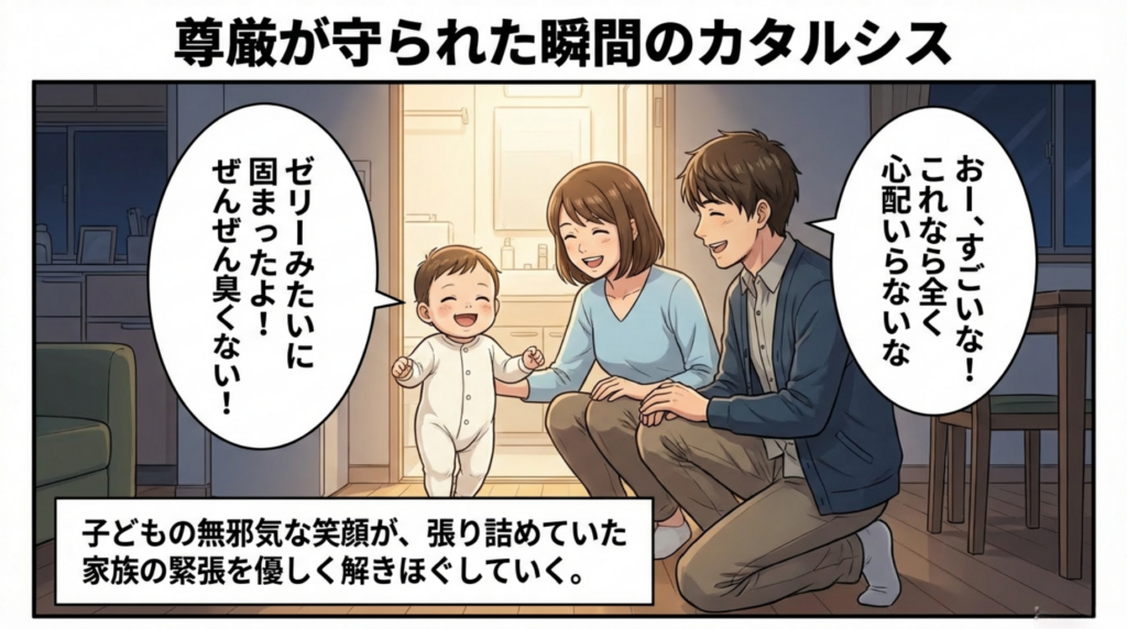 使い方は驚くほどシンプル。いつもの便器に袋を二重に被せ、用を足した後に凝固剤を振りかけるだけ。 「ゼリーみたいに固まったよ!ぜんぜん臭くない!」 尊厳が守られ、無邪気に笑う子どもの笑顔が、張り詰めていた家族の緊張を優しく解きほぐしていきます。使用済みの袋は空気を抜いてきつく結び、ゴミ収集の日まで衛生的に保管することができました。