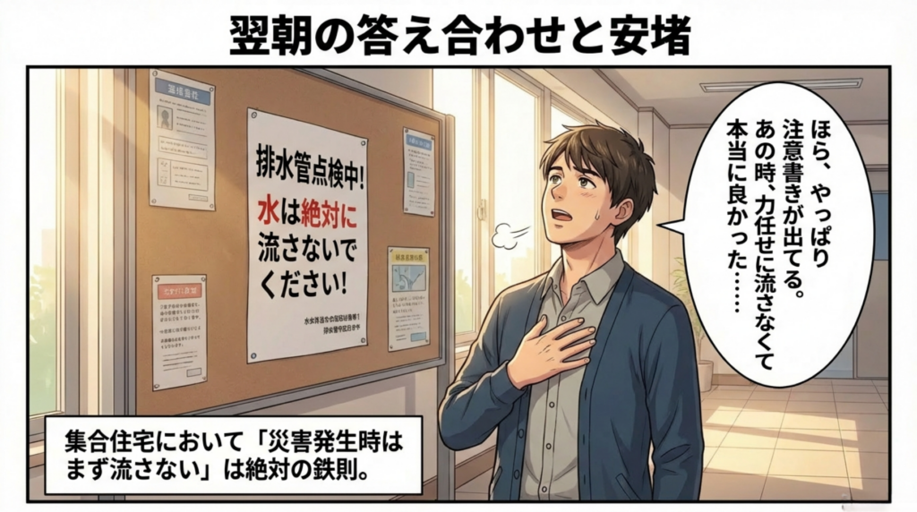 翌朝、マンションの掲示板には**「排水管点検中!水は絶対に流さないでください!」**という強い注意書きが。 あの時、力任せに流さなくて本当に良かった……。パパは心底安堵します。