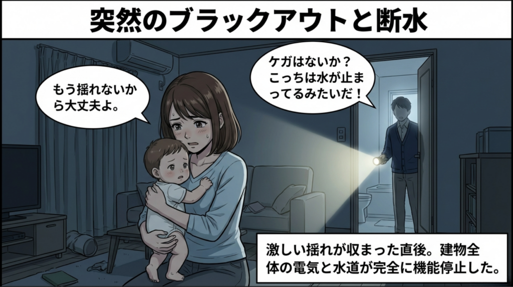 「もう揺れないから大丈夫よ」 激しい地震の揺れが収まり、ホッと胸を撫で下ろしたのも束の間。マンション全体が停電し、水道も完全に機能停止するブラックアウトと断水に見舞われます。