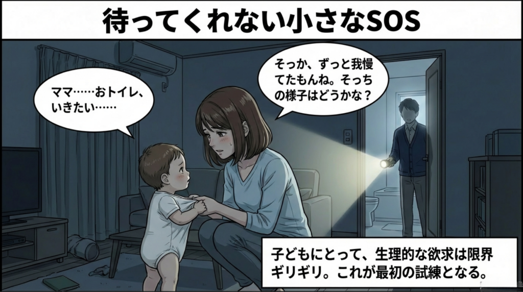 暗闇と不安が押し寄せる中、小さな子どもから待ったなしのSOSが。 「ママ……おトイレ、いきたい……」 子どもにとって生理的な欲求は限界ギリギリ。これが家族にとって最初の試練となりました。