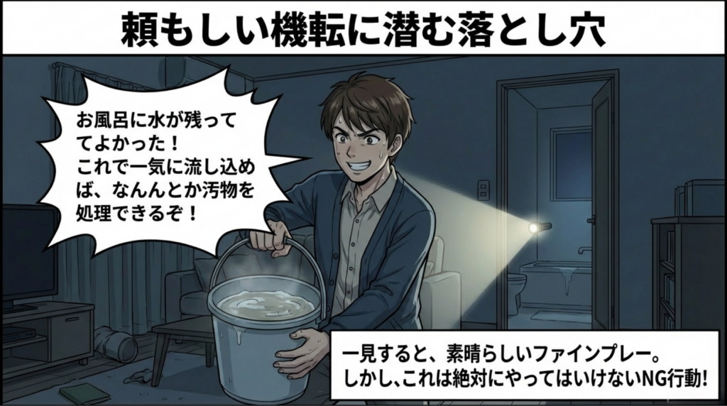 困り果てる状況の中、パパがお風呂の残り湯をバケツに汲んで走ってきました。 「これで一気に流し込めば、なんとか汚物を処理できるぞ!」 一見、頼もしい機転に思えます。しかし、これをママが間一髪で引き留めました。