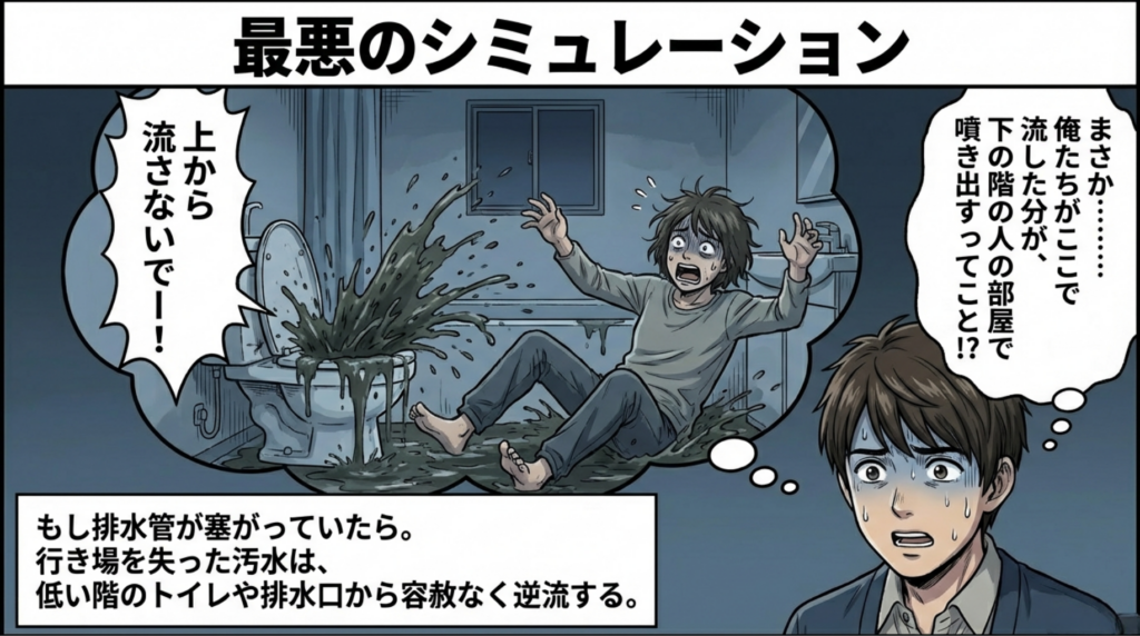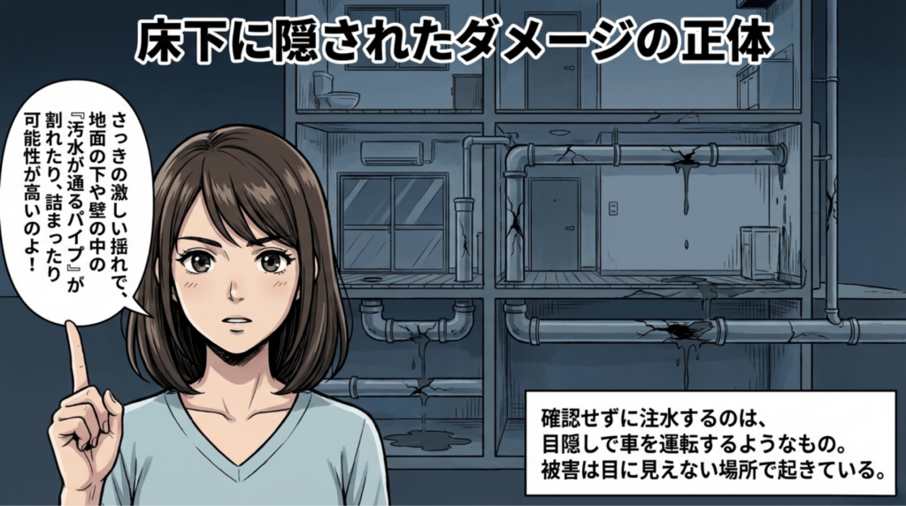 実は、地震直後のマンションで「無理に水を流す」のは絶対にやってはいけないNG行動だったのです。 激しい揺れによって、目に見えない床下や壁の中の「排水管」が割れたり、詰まったりしている可能性が高いからです。もし配管が塞がった状態で上から汚水を流せば、行き場を失った汚水は、下の階のトイレや排水口から容赦なく逆流し、激しく噴き出してしまいます。