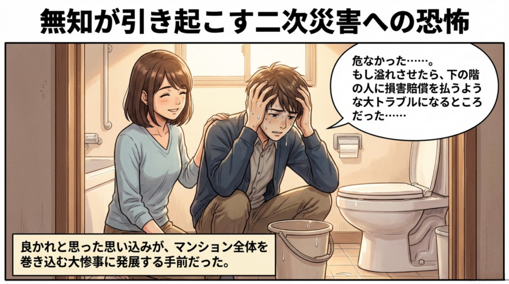 「もし溢れさせたら、下の階の人に損害賠償を払うような大トラブルになるところだった……」 無知が引き起こす二次災害の恐怖に、パパは青ざめ、へたり込んでしまいました。