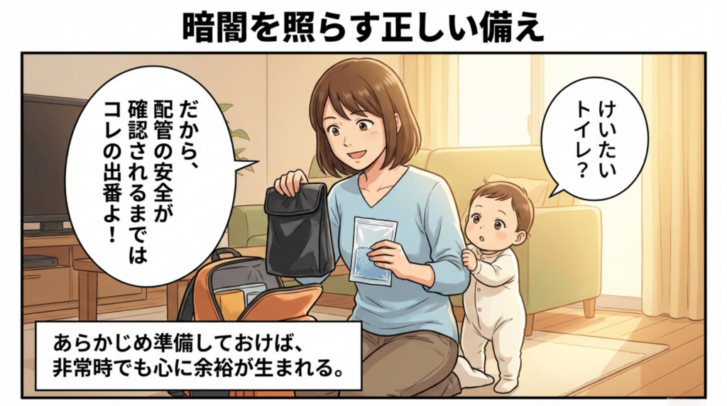 絶望的な状況の中、ママは冷静に防災リュックからあるものを取り出します。 それは**「携帯トイレ(簡易トイレ)」**でした。