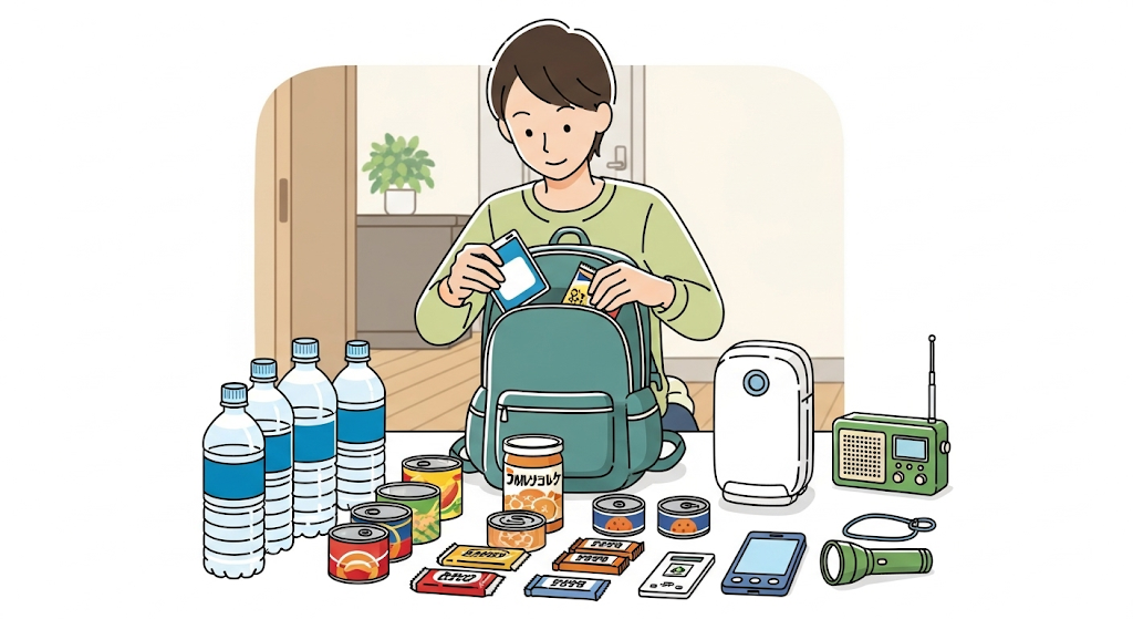 | 持ち歩き用 (外出時) | 災害は家にいる時に起こるとは限りません。外出先で被災した際に役立つ最低限のアイテムを、ポーチや防災ボトルにまとめて普段から携帯する習慣が大切です。 | ホイッスル ミニライト 圧縮タオル 常備薬・絆創膏 携帯食(ようかん等) 現金 モバイルバッテリー |