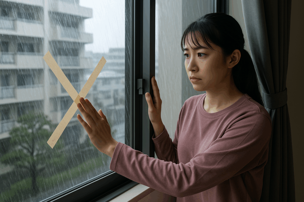 - 窓の保護:窓ガラスに養生テープや飛散防止フィルムを貼ることで、万が一割れた際の被害を最小限に抑えられます。