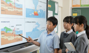 防災と理科の関係を学ぶ日本人親子の実写風イメージ|地震や台風の仕組みを中学生に解説するシーン