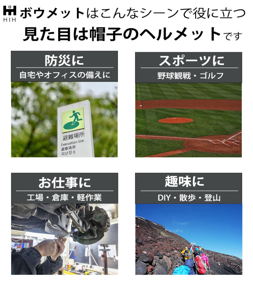日常の帽子感覚で被れるデザインながら、頭頂部に内蔵したプロテクターが衝撃を吸収します。防災用品としてさりげなく備えておけるだけでなく、DIYや軽作業、突起物の多い場所での作業、野球観戦などでも活躍します。