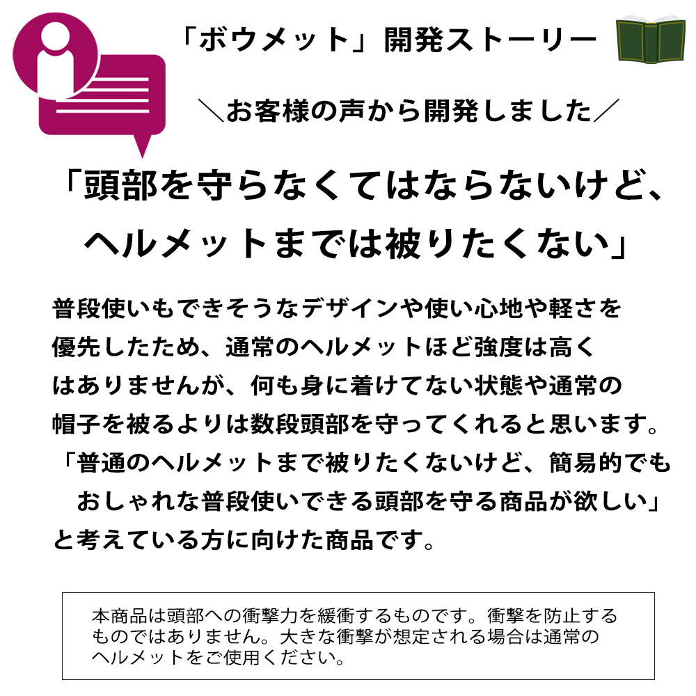 「防災頭巾やヘルメットまでは被りたくないけれど、頭部を守りたい」という声から生まれたボウメット。