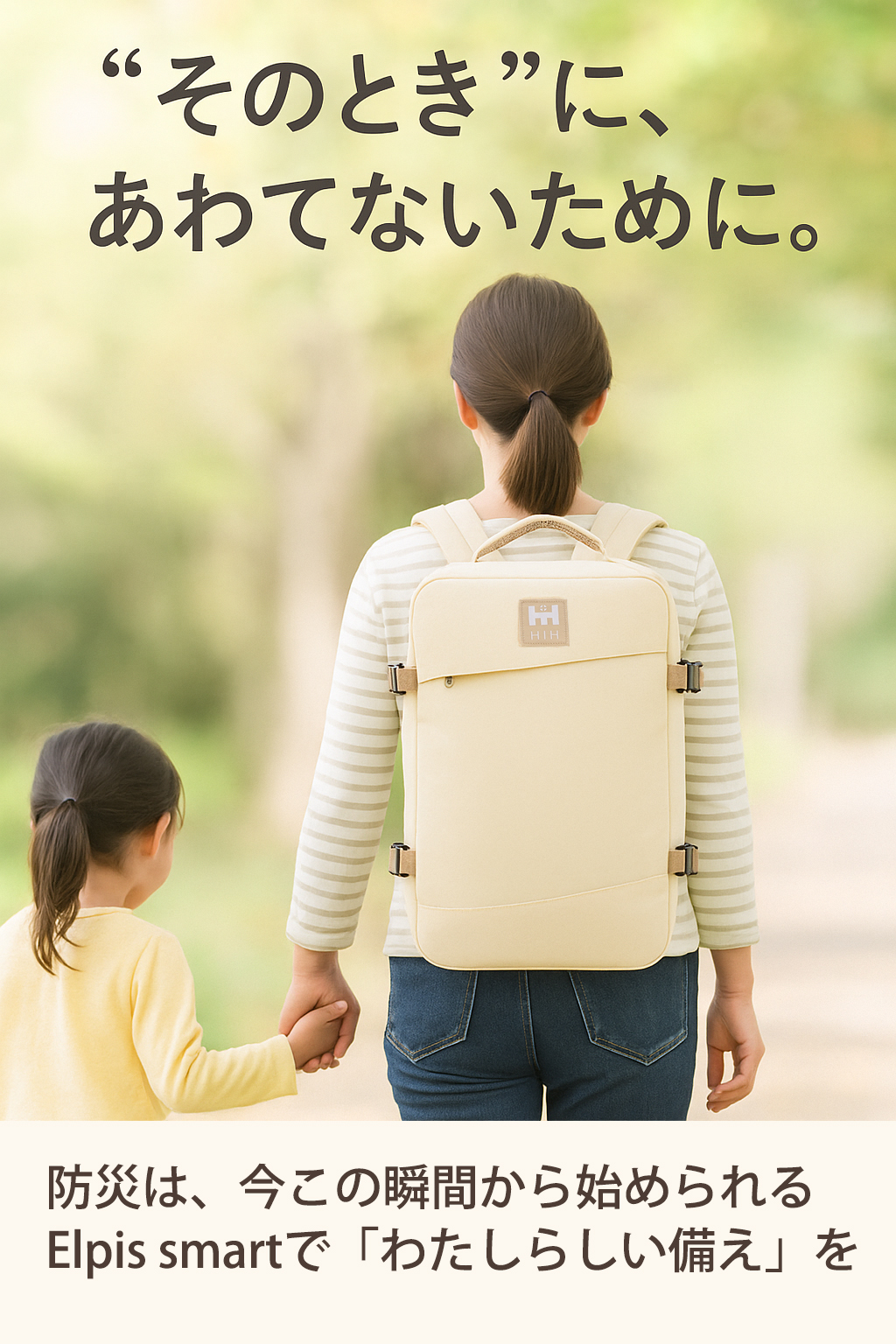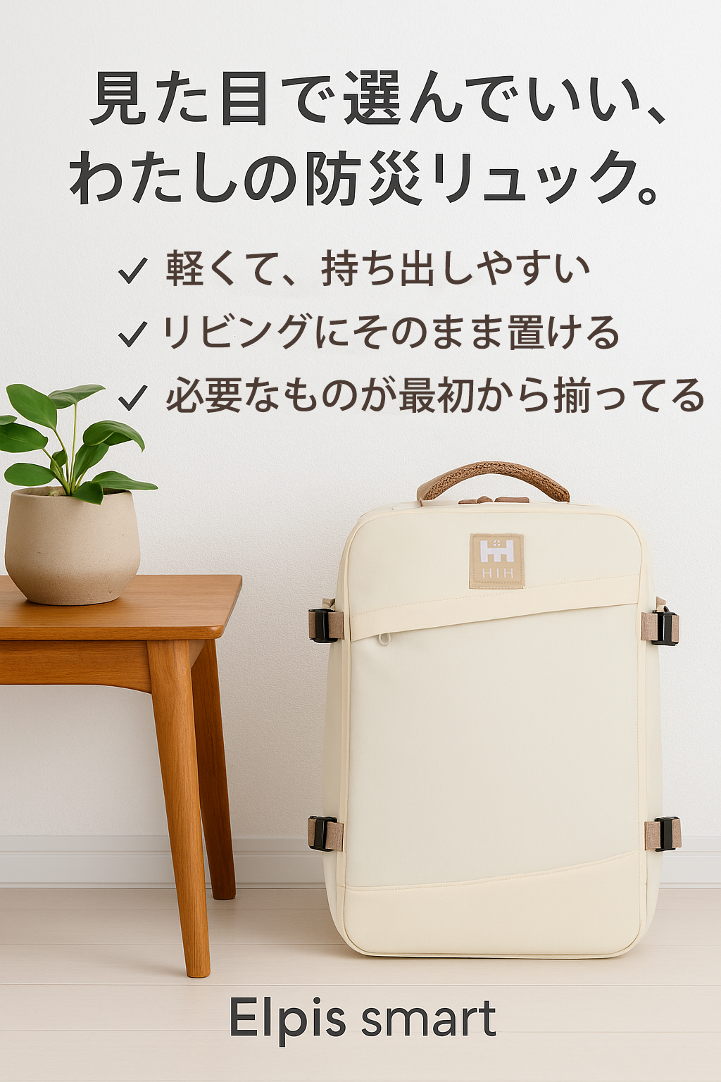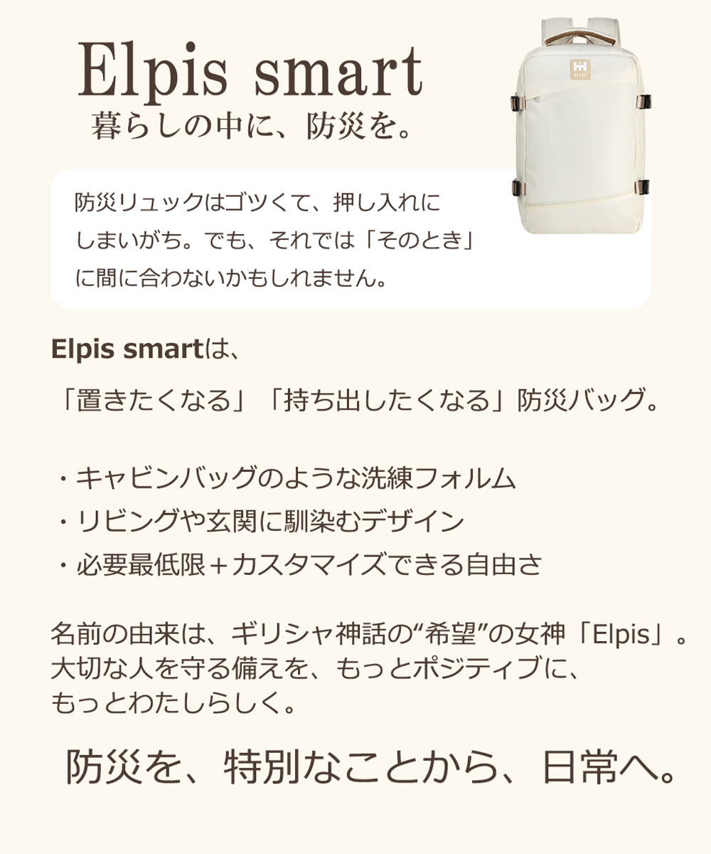 「Elpis smart(エルピス スマート)」は、キャビンバッグ風のスタイリッシュなデザインで、日常の暮らしに自然と溶け込む防災リュック。
