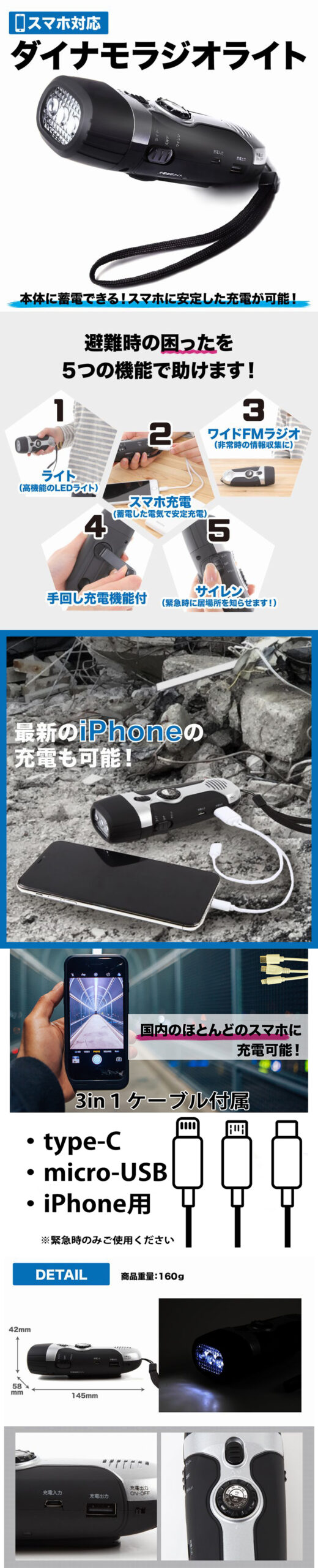 • スマホ対応ダイナモ充電ラジオLEDライト(3in1ケーブル付属)