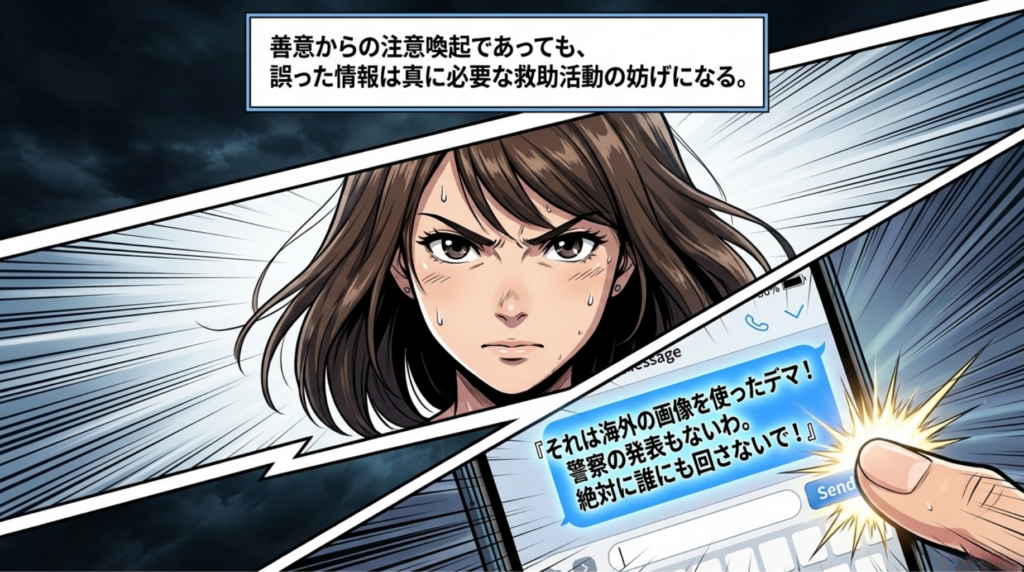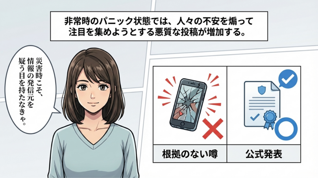 災害時に飛び交うショッキングな噂や画像。パニックに陥っていると、つい信じて「みんなに知らせなきゃ!」と善意で拡散してしまいがちです。しかし、誤った情報は正しい避難行動を遅らせるだけでなく、本当に必要な救助活動の妨げにもなります。