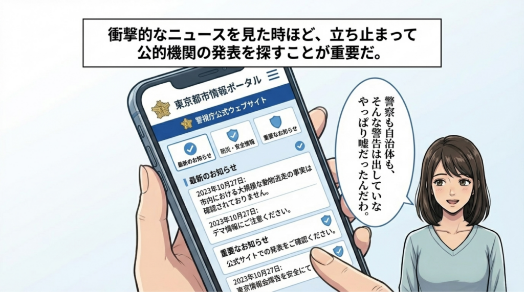 災害時のパニック状態では、人々の不安を煽る悪質なデマが増加することを思い出した彼女。すぐに自治体や警察の公式ポータルサイトを確認し、動物逃走の事実がないことを突き止めます。