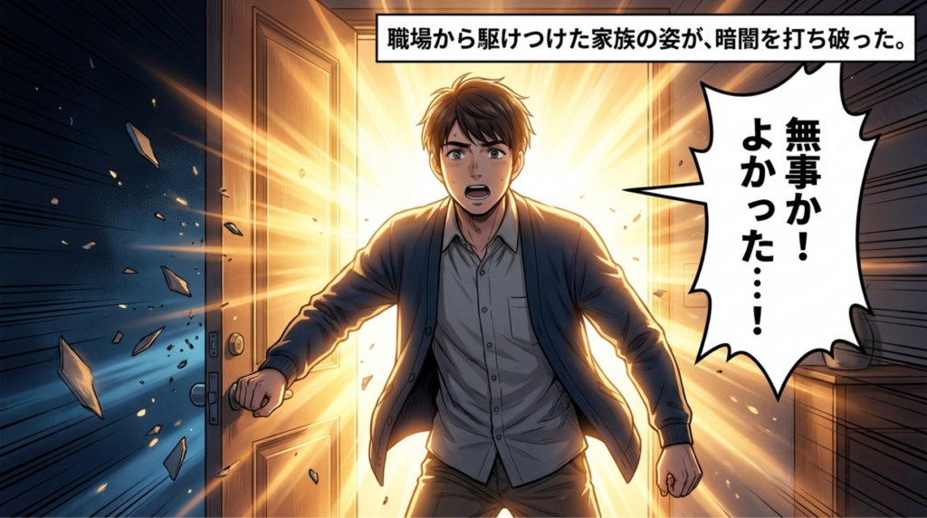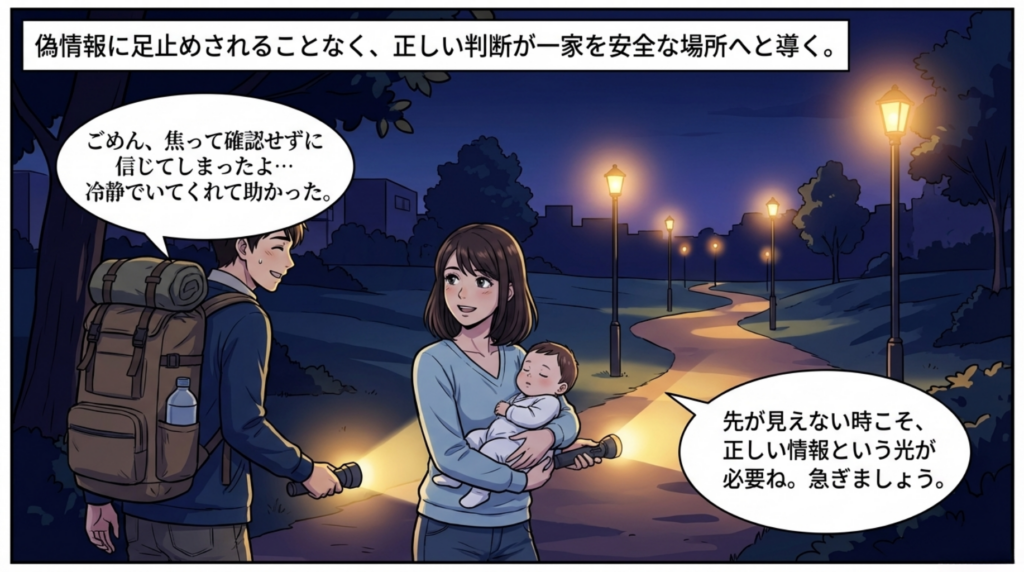 夫にも「それはデマ!絶対に誰にも回さないで!」と伝え、無事に合流した家族は、正しい情報の光を頼りに安全な避難所へと急ぐのでした。