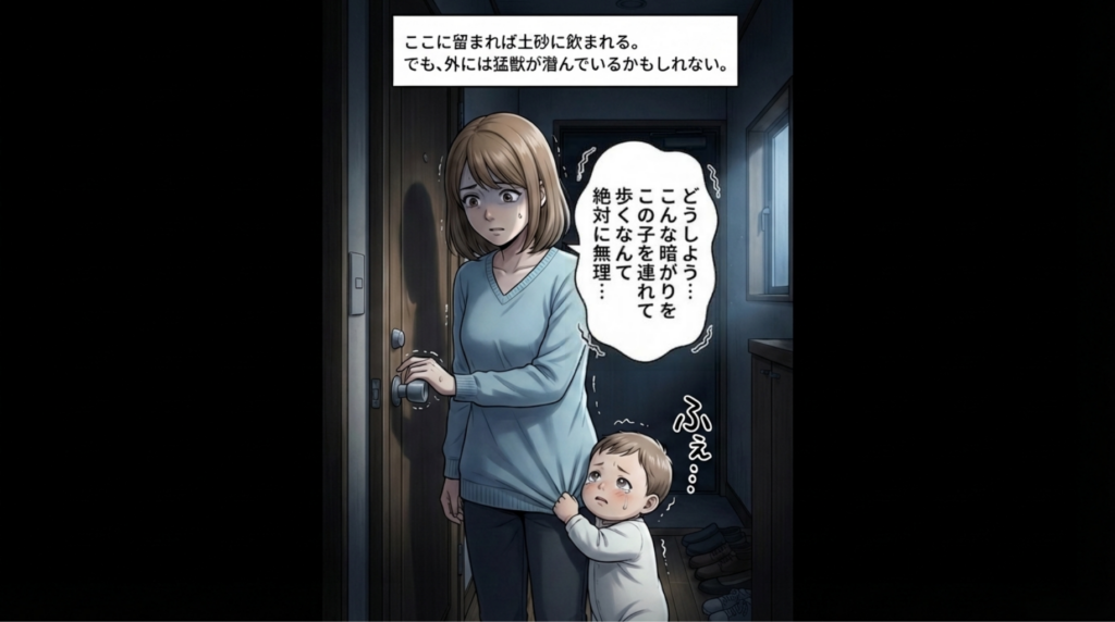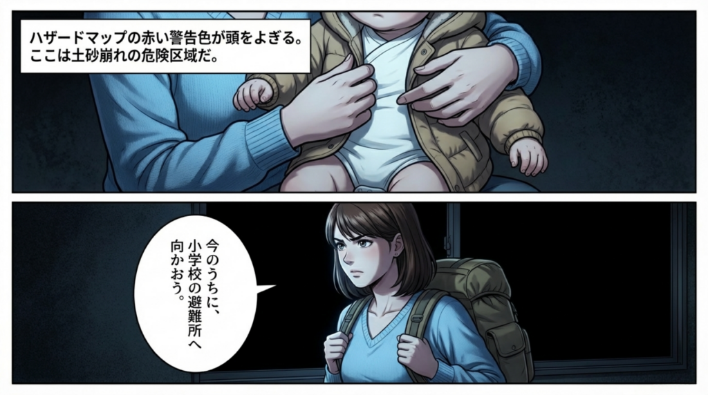 不安で泣き出しそうな我が子を抱きしめながら、母親の頭にはハザードマップの赤い警告色がよぎります。