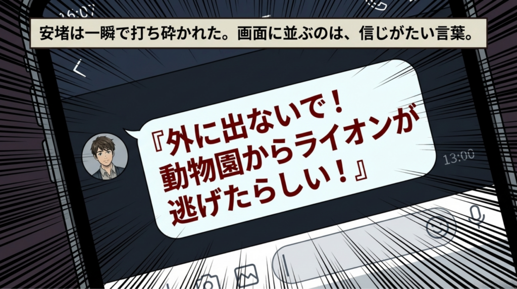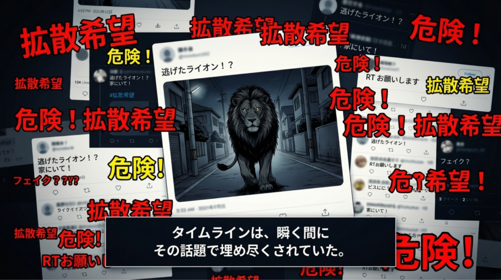 SNSのタイムラインを開くと、「逃げたライオン!?」「危険!」「拡散希望」の文字と、街中を歩くライオンの画像で溢れかえっています。
