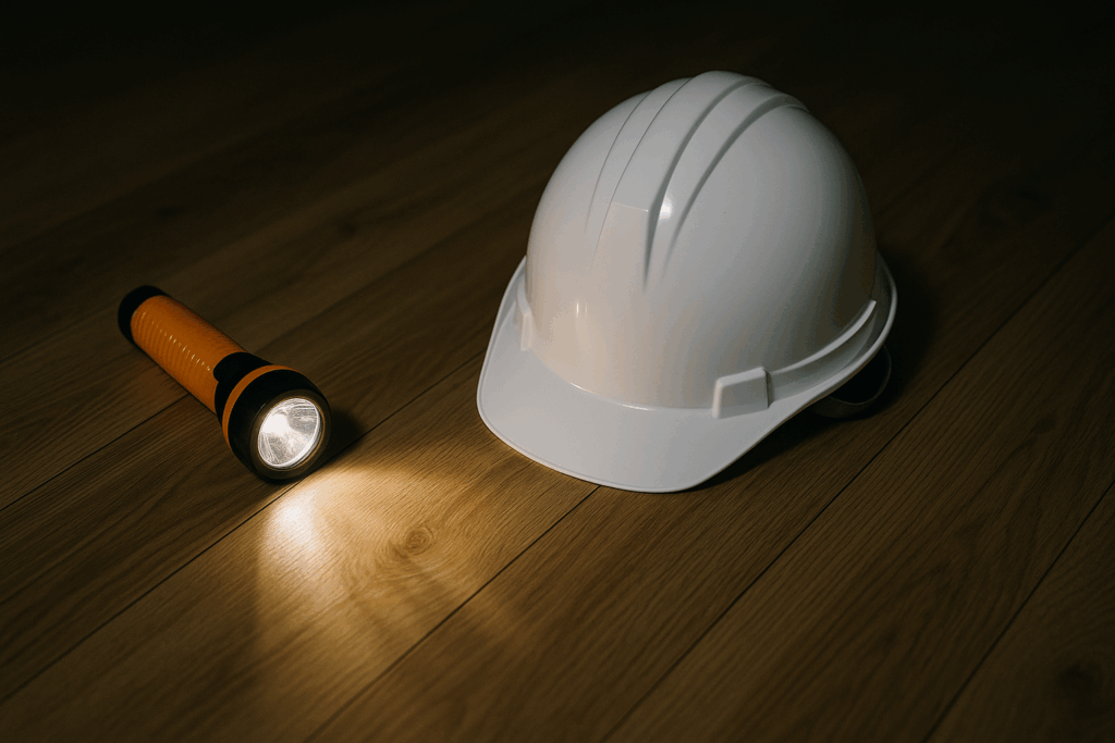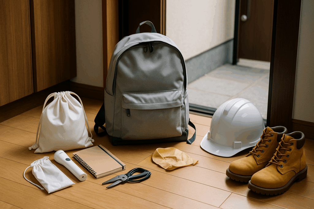 まず、避難行動そのものを安全にするための装備を考えましょう。ヘルメットや防災頭巾は、落下物から頭部を守るために不可欠です。これらは袋にしまうのではなく、玄関のドアや寝室の枕元など、すぐに手に取れる場所に置いておくのが鉄則です。同様に、停電時の暗闇や散乱したガラス片から足を守るための底の厚い靴やスリッパも、枕元に準備しておきましょう。