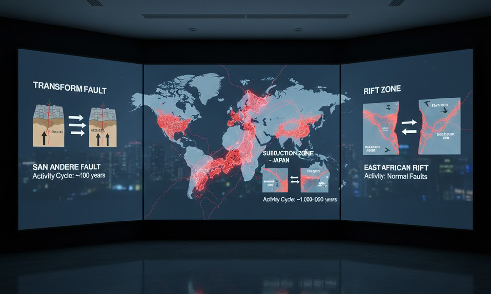 日本の内陸活断層が持つ、数百年から数万年という非常に長い活動間隔は、プレートの収束帯(沈み込み帯)という環境下で、大陸プレートの内部にゆっくりとひずみが蓄積するためです。一方、海溝型地震の発生間隔は100~200年程度とされており、活断層による地震とはサイクルが大きく異なります。この知識は、グローバルな視点から日本の地震リスクを再認識する上で役立ちます。