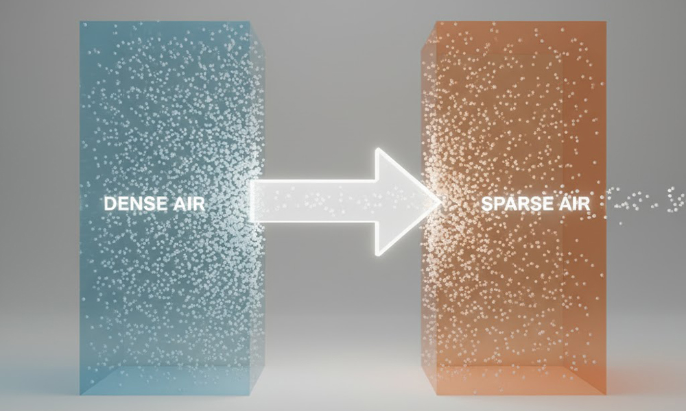 目に見えない空気ですが、実は重さがあります。そして、場所によって、空気がぎゅうぎゅうに集まっていて重くなっている場所と、空気がスカスカで軽くなっている場所があります。自然はバランスを取ろうとする性質があるため、空気は、 重い(密度が高い)場所から、軽い(密度が低い)場所へ と流れこもうとします。水が高いところから低いところへ流れるのと似ています。