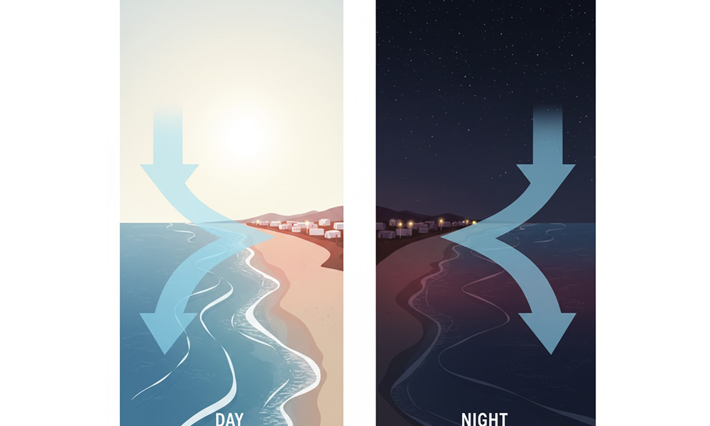 海の近くで、1日の中で風向きが変わる現象です。これは、陸(砂浜や地面)と海(水)では、温まりやすさと冷えやすさが違うために起こります。