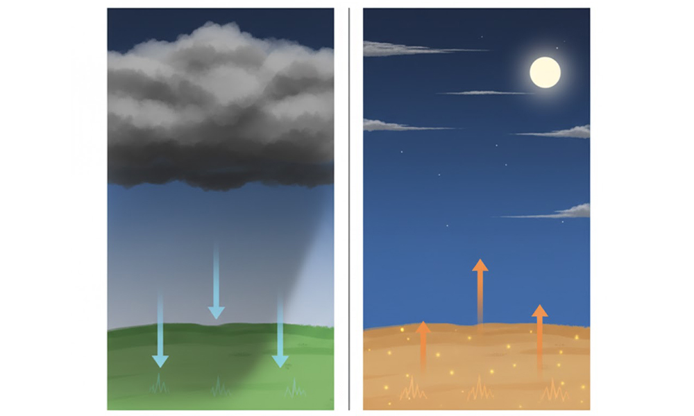 雲は地表に届く日射と、地表から逃げる熱に影響します。低く厚い雲が広がると太陽光が遮られ、気温は上がりにくくなります。高く薄い雲は太陽光を通しやすく、夜は地表の熱が宇宙へ逃げにくくなる傾向があります。風向や湿度、前線の位置と組み合わせて考えると、天気の見通しが精度よく立てられます。