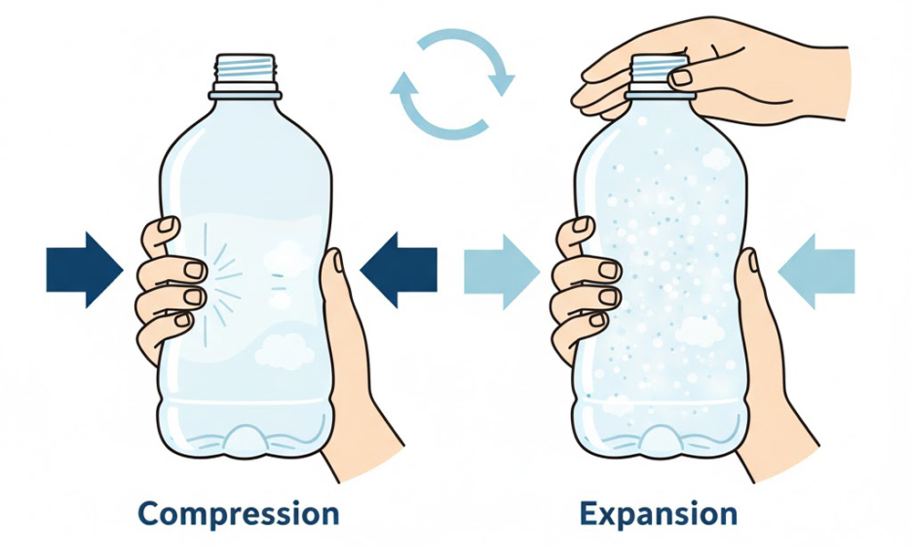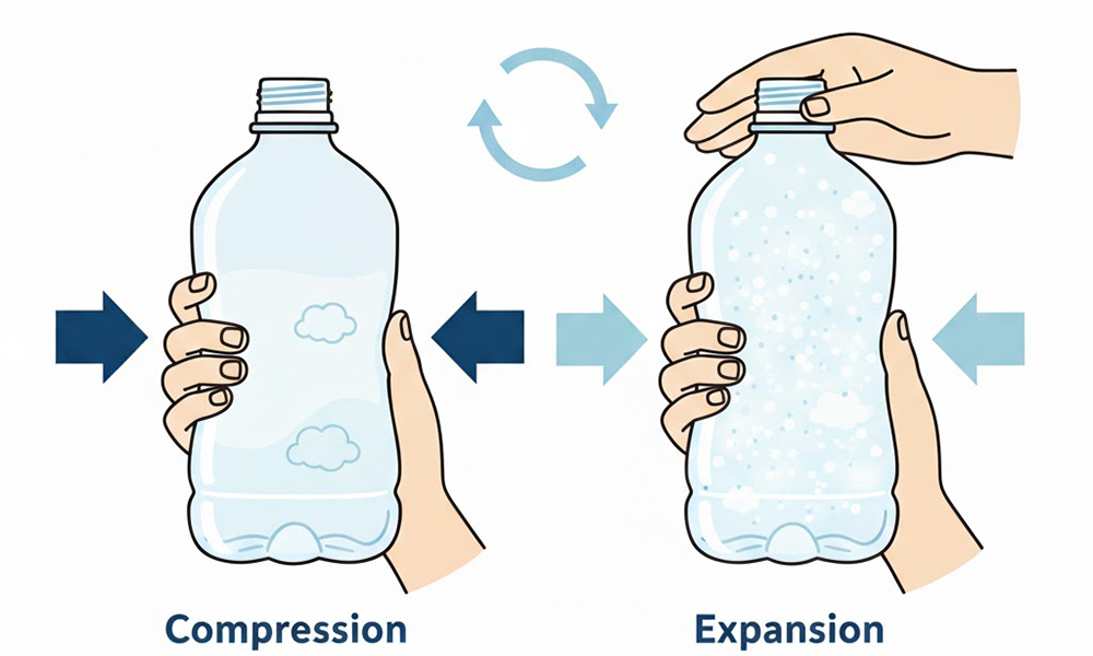 家庭でできる実験として、ペットボトルの中で雲を作る方法があります。ポイントは、圧縮して温め、急に膨張させて冷やすという流れです。ペットボトルを強く押すと内部の空気は圧縮されて温度が上がり、手を離すと一気に膨張して温度が下がります。温度が下がると空気が保持できる水蒸気の量が減り、白い濁りが現れます。これが雲と同じ原理でできた微細な水滴です。