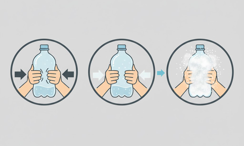 少量の水とエタノールを入れてふたをしっかり閉め、ペットボトルを数回強く押す→一気に離すを繰り返します。透明になったり白く濁ったりを交互に確認し、圧縮の強さや回数、煙の有無を一度に一条件だけ変えて比較します。写真や動画で記録すると、後で気づきを整理しやすくなります。
