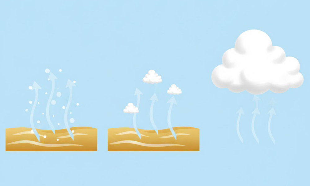 学習用の一般的な説明では、雲の生成は上昇気流と冷却の結果として整理されています。気象庁の基礎解説や教材でも同様の流れで示されています。(参照:気象庁 公式サイト)