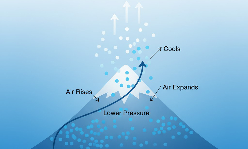 空気は上に行くほど気圧が低くなります。気圧が下がると空気は膨張し、仕事をするため温度が下がります。これを断熱膨張と呼びます。温度が下がると空気が保持できる水蒸気の量が減り、余った水蒸気が雲粒へと変化しやすくなります。逆に下降する空気は圧縮されて温度が上がり、雲は消えやすくなります。