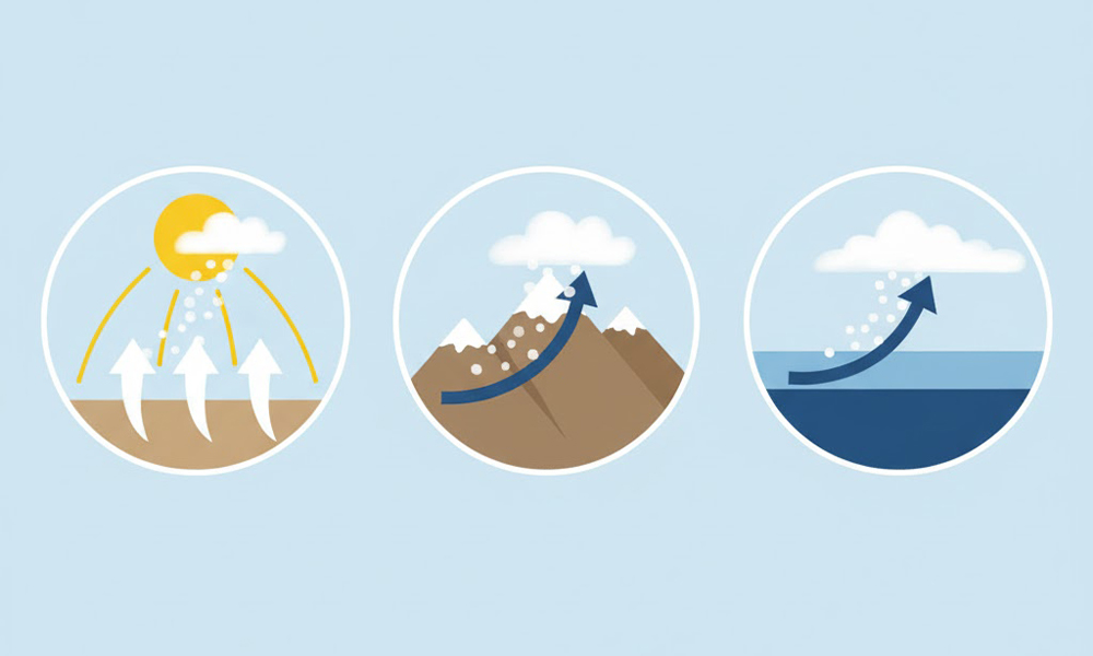 学習では、雲を作る典型的な場面を三つに整理すると理解が進みます。第一に、晴れて日射が強い日に地表が温まり、地面付近の空気が軽くなって上昇する場合です。午後に積雲が発達しやすいのは、このタイプの上昇が関わります。第二に、地形による持ち上げです。風が山にぶつかると空気の流れは斜面に沿って上がり、山の風上側で雲ができやすくなります。第三に、前線付近で暖かい空気が冷たい空気の上にはい上がる場合です。広い範囲で層状の雲が広がり、雨になりやすくなります。