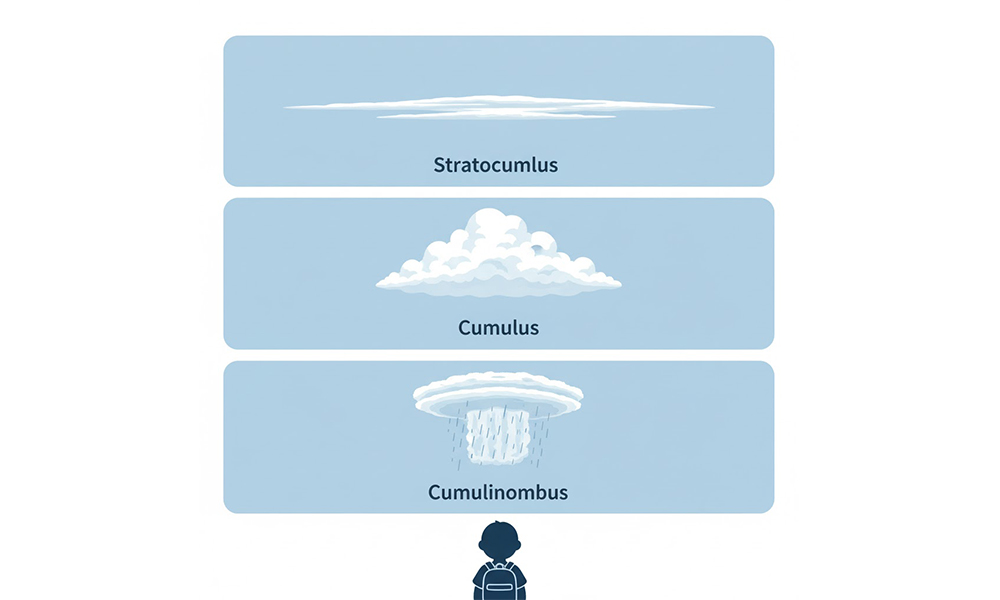 雲の分類は観察の第一歩です。層状に広がる雲は空一面を覆って日射を弱め、天気の下り坂につながることがあります。もくもく立ち上がる雲は上昇気流の強さを示し、にわか雨や雷雨のサインに変わることがあります。代表的な種類をつかむと、雲から天気の見通しを立てやすくなります。