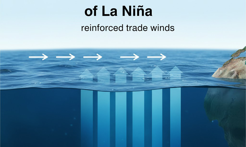 ラニーニャ現象時には、貿易風が強まることで、温かい海水が西側にさらに強く吹き寄せられ、西部に暖かい水の層がより厚く蓄積します。その結果、東部では風に押し流された海水を補うために、深海からの冷たい水が平常時よりも**強く、大量に**海面近くまで上がってきます。これを**湧昇現象の活発化**と呼びます。