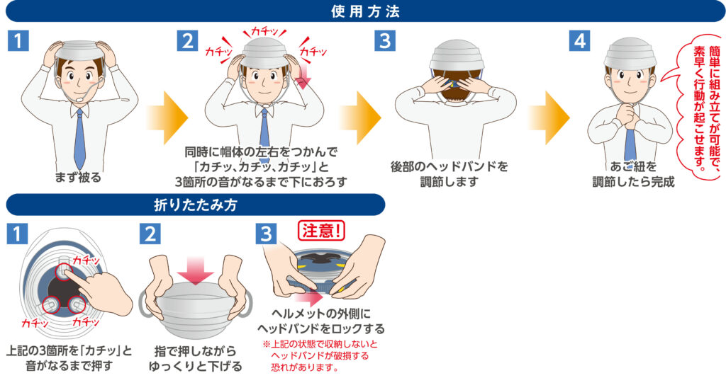/ 特徴 業界最小級A4用紙サイズに収まり厚さ4.5センチの収納性・機動性・安全性に優れた折り畳めるヘルメット