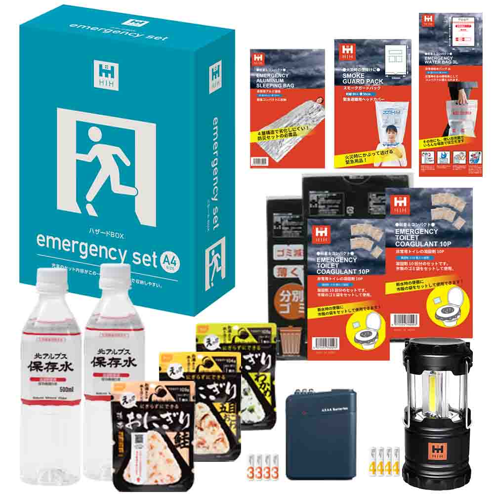 非常時に特に困るトイレ問題を解決する凝固剤を20個標準装備し、保存水・食料・衛生用品などの基本アイテムを厳選。