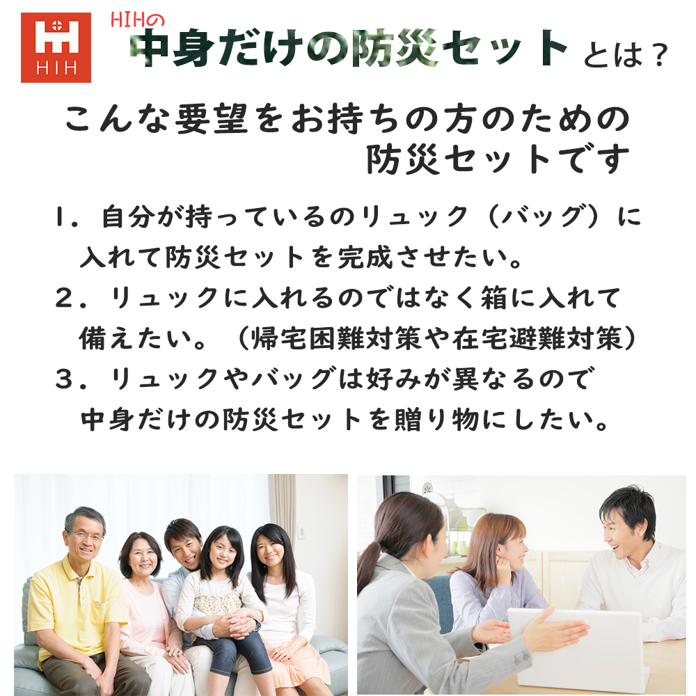 「HIH 防災セット(リュックなし)」は、次のような方におすすめの防災グッズ一式です。
