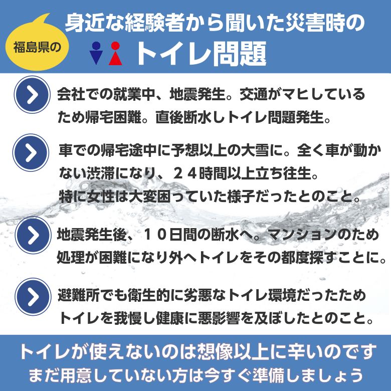 災害時にもっとも困るのが「トイレの確保」。断水や停電でトイレが使えなくなると、衛生面やストレスの大きな問題になります。
