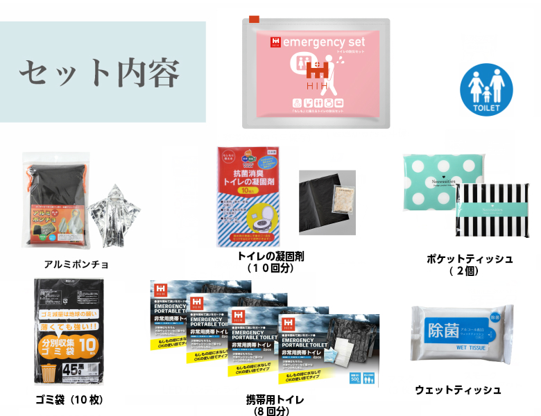 凝固剤と携帯トイレを十分な回数分セット。ポリ袋とティッシュ・ウェットティッシュも付属し、処理や衛生維持をサポート。 - オフィス・車・外出先にも対応