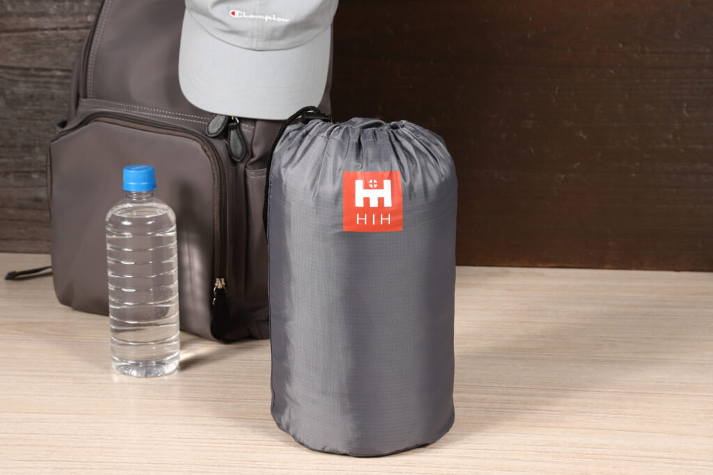 例えば、HIH防災用シュラフの収納サイズは(約)直径15cm×高さ25cmとなっており、まさしくリュックに入る理想的なサイズ感を実現しています。自宅での保管時にも場所を取らないため、備蓄品として重宝するでしょう。
