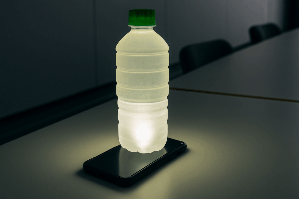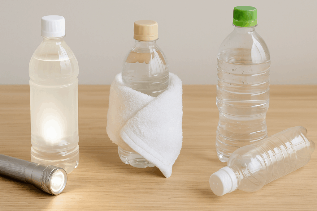 停電時、懐中電灯の光は直線的で、広範囲を照らすのには向きません。しかし、水を入れたペットボトルを置くだけで、その光を拡散させ、部屋全体を柔らかく照らすランタンに早変わりします。