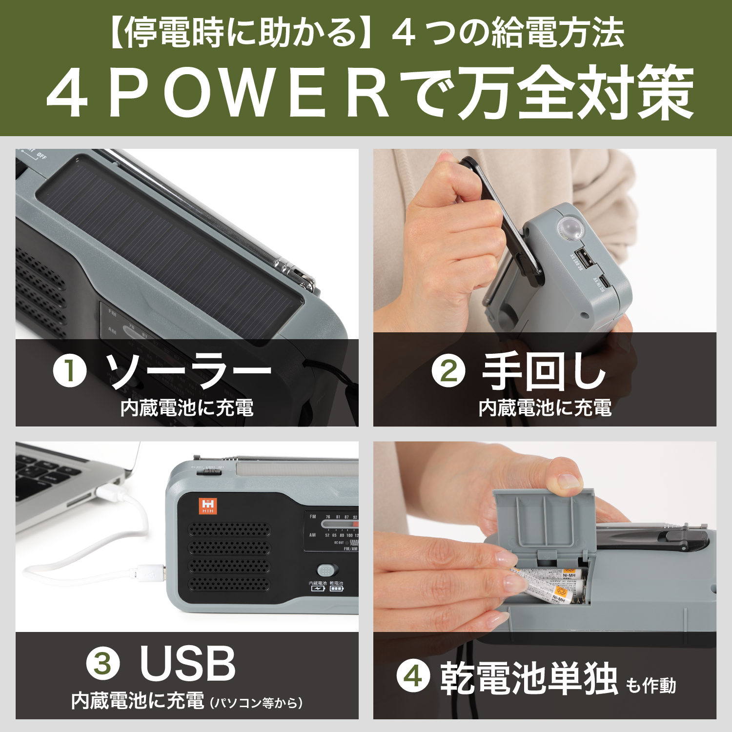 ソーラー/手回し/USB/乾電池に対応。ラジオ・LEDライト・アラート・**スマホ充電(3in1ケーブル付属)**まで1台でカバー。停電時も安心。