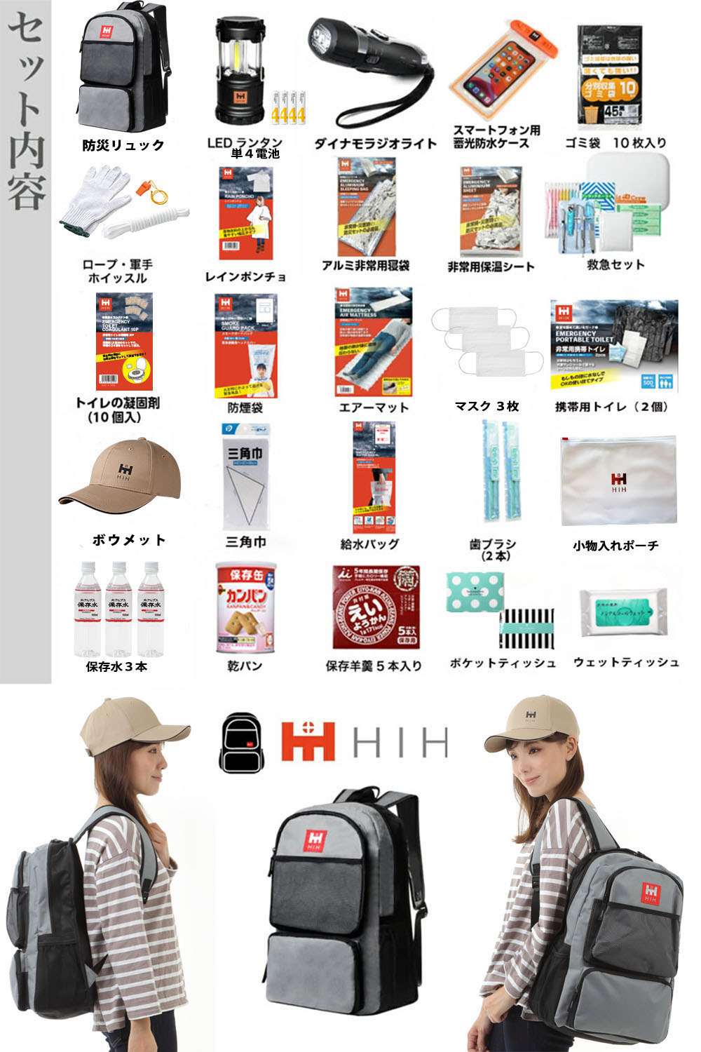 防災リュック/ボウメット(ブラックorベージュ)/防災ラジオライト(3in1ケーブル付属)/光る防水スマホケース/COBミニスライドランタン/単4電池(必要本数分)/カンパン/井村屋えいようかん/保存水(3本)/非常用給水バッグ/携帯用トイレ(2個)/トイレ凝固剤(10個入)/ポリ袋(10枚入)/マスク(3枚)/スモークガードパック/小物入れポーチ/エマージェンシー3点セット(軍手・笛・ロープ)/冷熱遮断エアーマット/簡易寝袋/歯ブラシ(2本)/レインポンチョ(男女兼用1組)/アルミ保温シート/ポケットティッシュ(2個)/ウェットティッシュ/三角巾/エイドクルー9点(爪切り・はさみ・耳かき・ピンセット・爪ヤスリ・絆創膏・綿棒・包帯・コットンパフ)