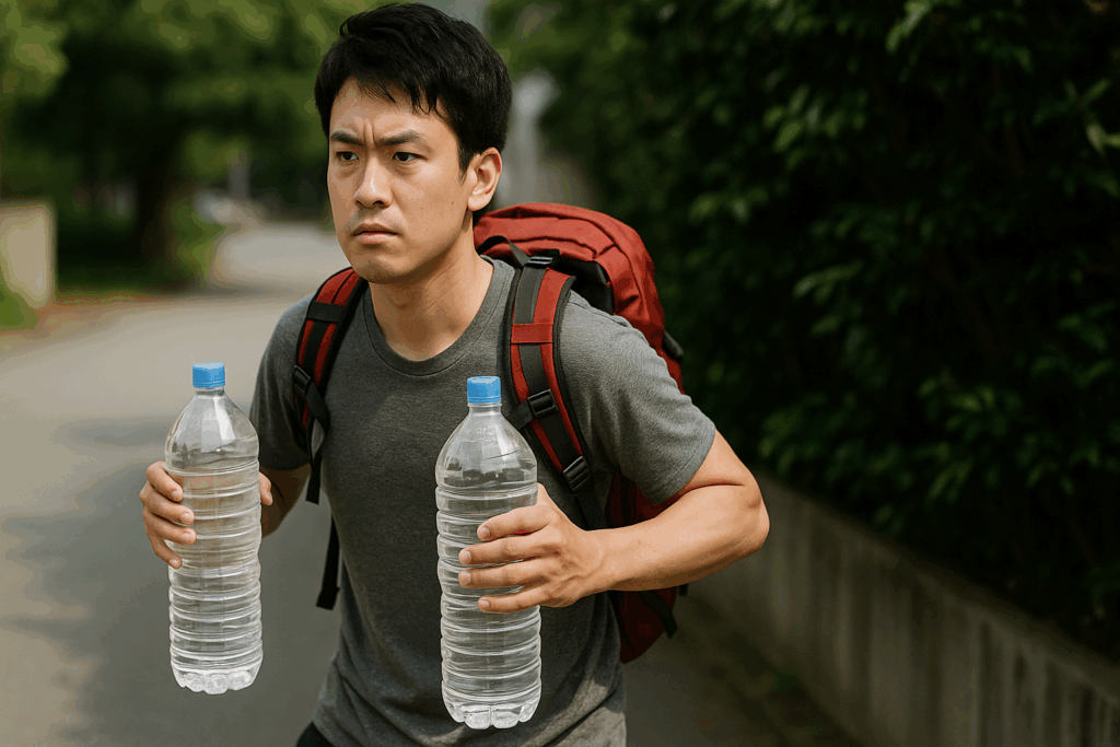 避難時には、走る、乗り越える、かがむといった多様な動きが求められます。このような状況を考慮すると、リュック全体の重さは、体力に自信がある方でも12〜13kg、一般的には10kg以下に抑えるのが安全のセオリーです。他の荷物(食料、衣類、バッテリーなど)の重さが、どんなに切り詰めても平均して4〜5kg程度にはなると仮定すると、水に割ける重さは自ずと5〜6kg、つまり5〜6リットルが物理的な上限と言えます。しかし、これはあくまで計算上の上限です。実際に5kg以上の水を背負って迅速かつ安全に行動するのは、日常的にトレーニングを積んでいる人でない限り、極めて困難です。