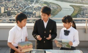 扇状地の地形と人の暮らしを俯瞰し学びの重要性を伝える実写風イメージ