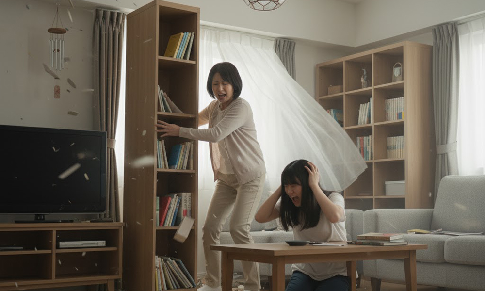 この震度レベルから、固定されていない家具が移動・転倒するリスクが非常に高まります。タンスや冷蔵庫、食器棚などの家具固定は、生命を守るための最低限の地震対策です。