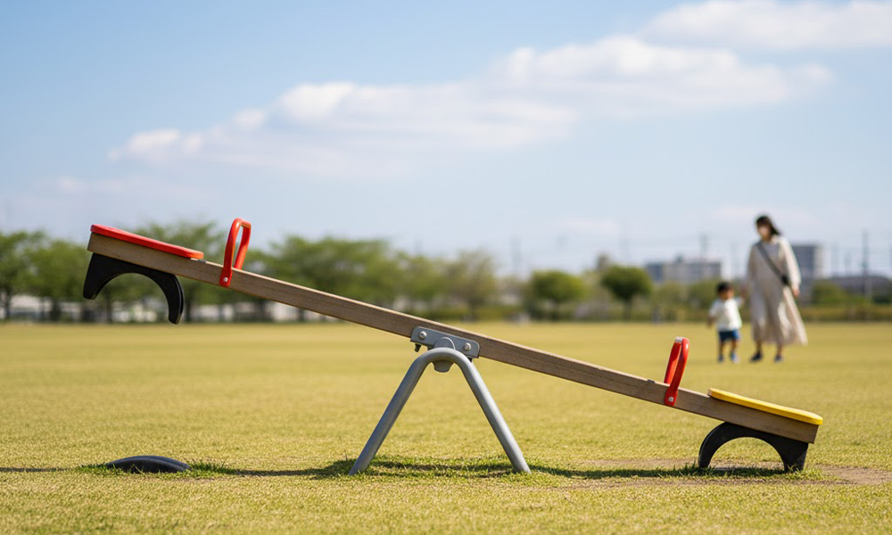 一番イメージしやすいのは、公園にあるシーソーです。例えば、自分よりもずっと体重が重いお父さんやお母さんとシーソーに乗る時を想像してください。もし二人が支点(真ん中の軸)から同じ距離の場所に座ったら、体重が重い方が下に下がってしまい、つり合いませんよね。