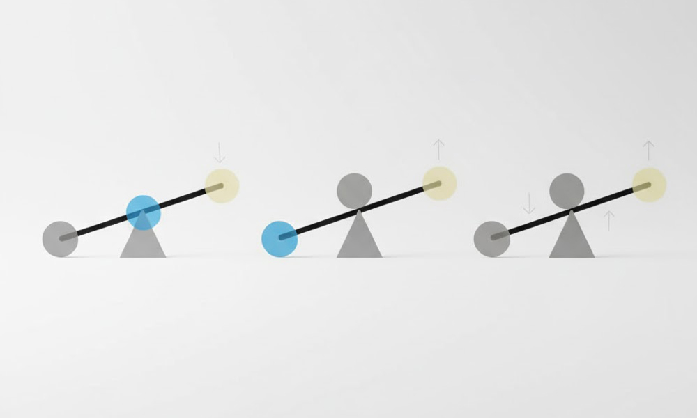 このように、重い人(大きな力)でも、支点からの「距離」を短くすれば、軽い人(小さな力)が支点から「距離」を長くすることで、つり合わせることが可能になります。この「力と距離の関係」こそが、てこの原理の基本的な考え方です。