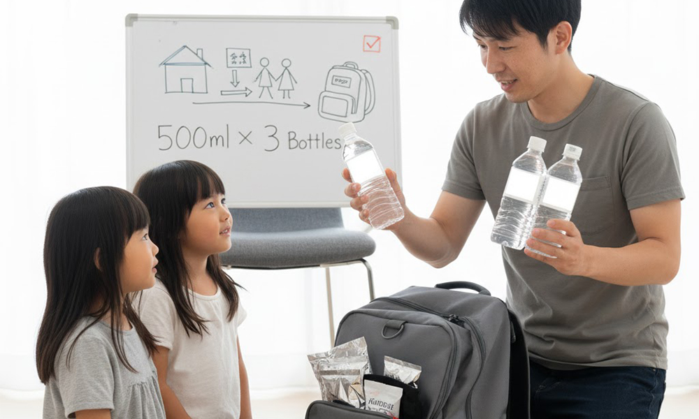 防災リュックに水は何日分必要ですか?という質問に対しては、結論として「最低限の1日分、またはそれ未満」と答えるべきです。 なぜなら、防災リュックは第1次避難、つまり安全な避難所へたどり着くまでの「命を守るための道具」に厳選されているからです。 国が推奨している飲料水の備蓄量は「1人1日3リットルを最低3日分」ですが、これは自宅や職場などに備蓄しておくべき量(第2次避難・第3次避難用)であり、避難時に背負って持ち出すリュックの量ではありません。 リュックには、避難中に水分補給ができる程度の、最小限の飲料水を入れておくことを推奨いたします。