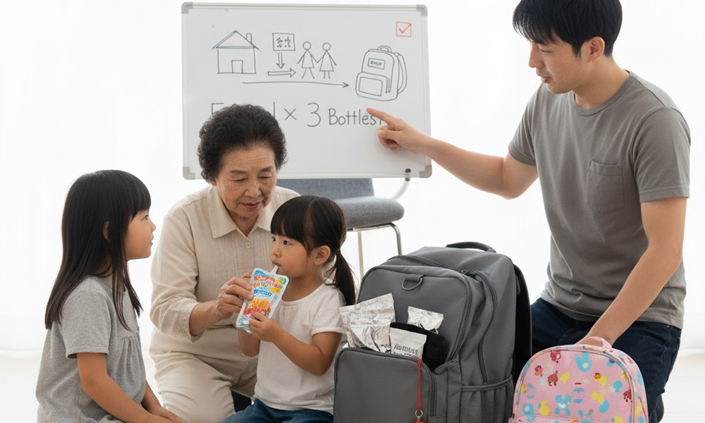 • 小分けサイズ:子どもでも飲みやすい500ml以下のペットボトルや、ゼリー飲料なども用意すると、こまめな水分補給を促せます。
