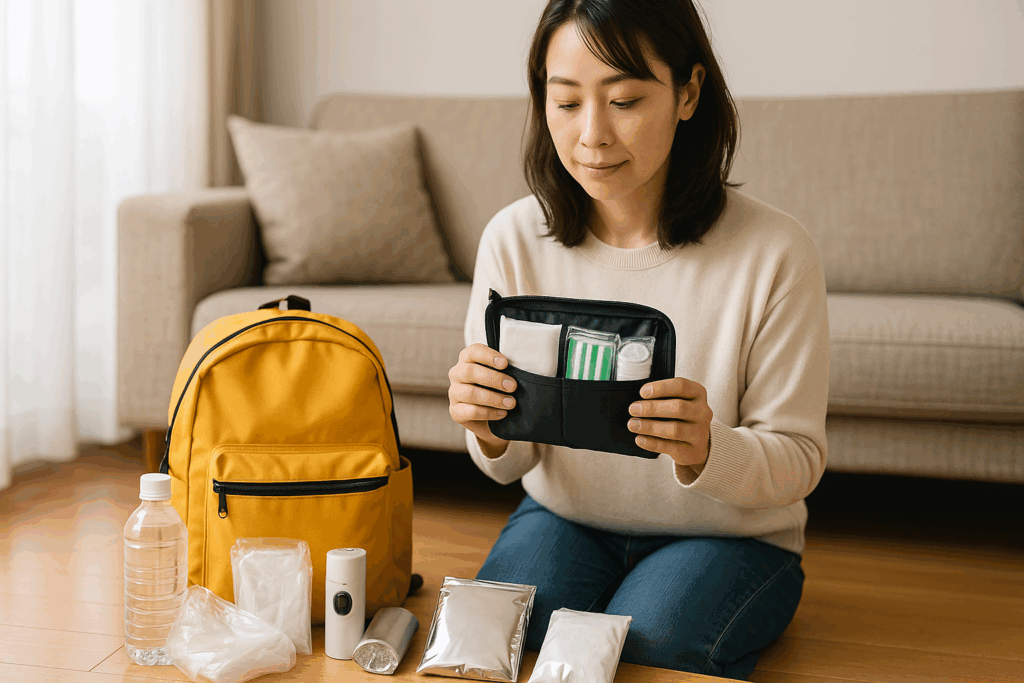 モバイルバッテリー、LEDライト、常備薬、現金、携帯トイレ(1〜2個)、ウェットティッシュ、マスク、お菓子少量の生理用品やおりものシートは急な体調の変化に備えて必須です。防犯ブザーは通勤・通学バッグにつけておきましょう。髪ゴムや手鏡、リップクリームなど、最低限の身だしなみ用品も精神的な安定に繋がります。